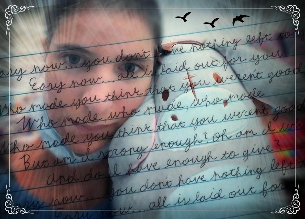 I remembered my Eeyore selfie and came up with a fresh idea. I wrote out the lyrics to Easy in my best “pandemic cursive,” snapped a picture of it, and layered the transparent sheet of words over my image, resulting in: